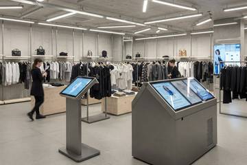 Tienda de ropa futurista con un diseño minimalista, donde los clientes interactúan con pantallas táctiles y tecnología digital para explorar productos creados con una herramienta de inteligencia artificial para ilustración. Credits: FashionUnited//Alicia Reyes Sarmiento.