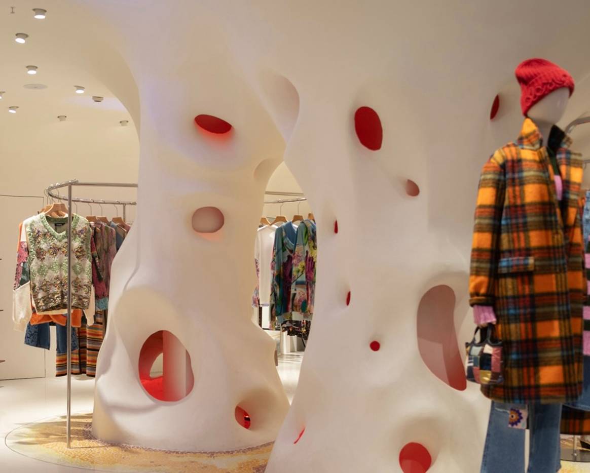 Con una superficie de unos 230 metros cuadrados, y una oferta comercial integrada por una elevada selección de prendas de indumentaria femenina y de complementos, la nueva tienda en China de Desigual ha pasado a abrir sus puertas en el interior del centro comercial Lady Fashion Mall de Shanghái. Un complejo que ha sufrido un profundo proceso de renovación durante los últimos seis meses que, como resultado, lo han llevado a dejar de lado su anterior modelo tradicional como galería comercial, para presentar en contra una nueva división especial, albergando en su interior un gran espacio multimarca “Lady Huaihai” especializado en la comercialización moda femenina, junto a hasta siete tiendas de primer nivel, entre las que se encuentran la primera “flaghip store” de la firma italiana de decoración Seletti en la región de Asia-Pacífico, la primera tienda de la firma de moda estadounidense Gramicci en China, y esta nueva y tercera tienda de Desigual en China. Un establecimiento que, más allá de ahí, se presenta como la primera “flagship store” de Desigual en implementar su renovado concepto de tienda. Un nuevo modelo que se destaca por contar con un interior perfectamente alineado con el ADN y con los orígenes de la firma barcelonesa, y con la singularidad de, a partir de esos códigos vertebradores, ir adaptándose a las particularidades de cada nueva ubicación, para generar sensaciones e impresiones únicas a los miembros de la amplia comunidad de clientes de Desigual. Unas ambiciones que, para lo que respecta a este caso y al de esta nueva tienda de Shanghái, han llevado a la concepción de una ambientación naturalista de una potente luminosidad, inspirada en las obras clave del modernismo de Gaudí, del que es hogar y epicentro la misma ciudad de Barcelona en la que Desigual arrancó su andadura hacia el año 1984, y de la que ha logrado llevar una pequeña muestra hasta China, de la mano de esta “flagship store”.